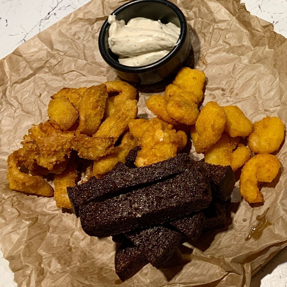 креветки в кляре, кольца кальмара в кляре, гренки чесночные, соус цезарь