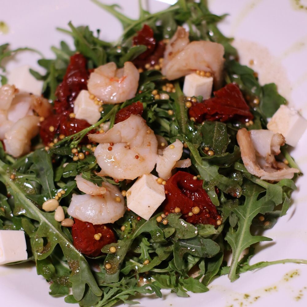 руккола, креветки, вяленые томаты, фирменная заправка, фета, кедровые орешки