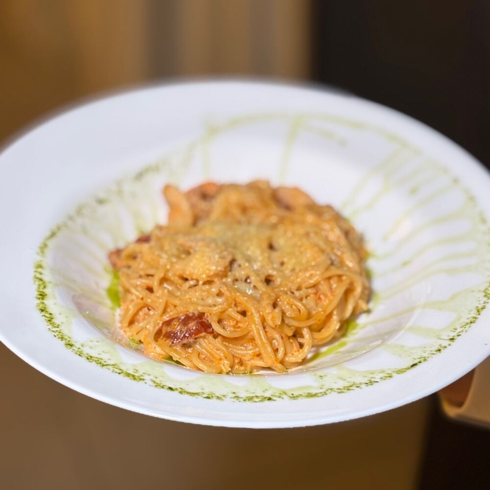Предупреждаем: за время доставки паста может потерять свой первоначальный вид и консистенцию, просим учитывать эту особенность блюда при заказе доставки или самовывоза. Состав: Спагетти, креветки, паста россо, вяленые томаты, сливки
