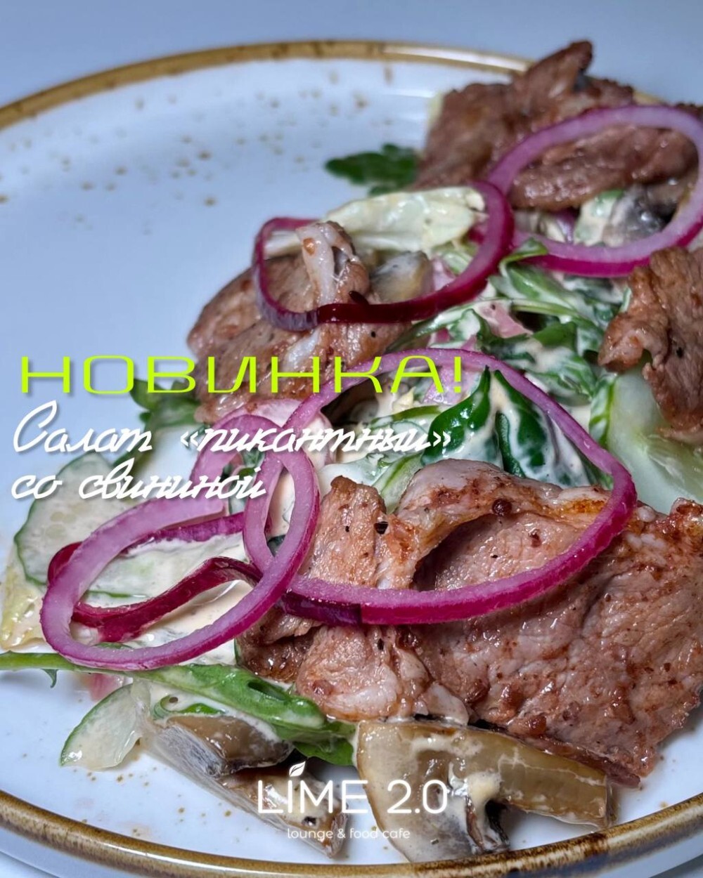 Микс салата, свиная шея, огурцы, шампиньоны, маринованный лук, соус пикантный