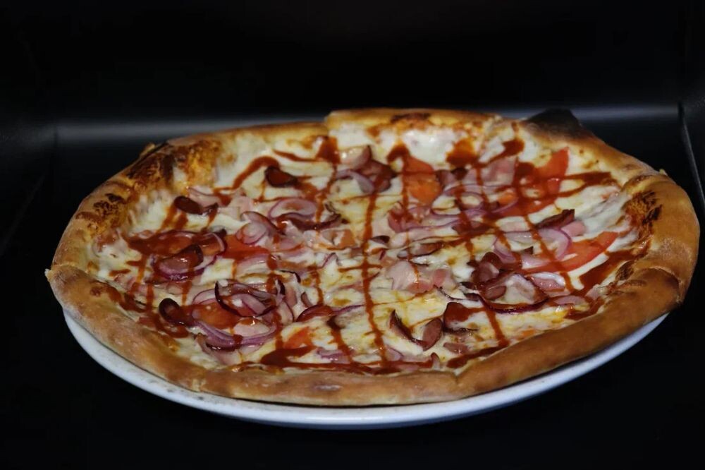 Сыр моцарелла, бекон, охотничьи колбаски, красный лук, помидоры, тобаско
