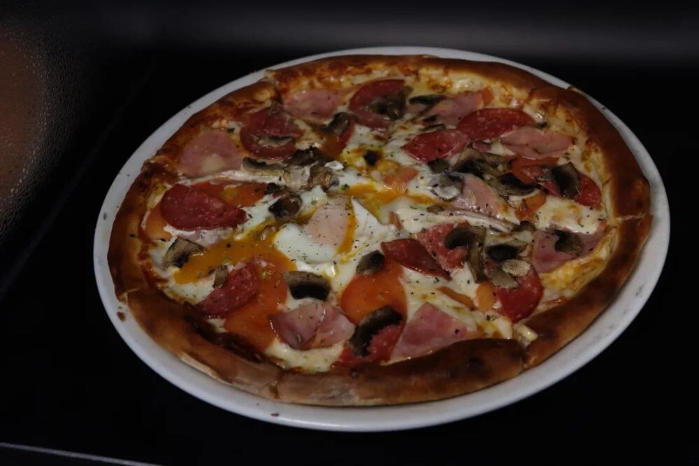 Салями, ветчина, помидоры, шампиньоны, сыр моцарелла, яйцо