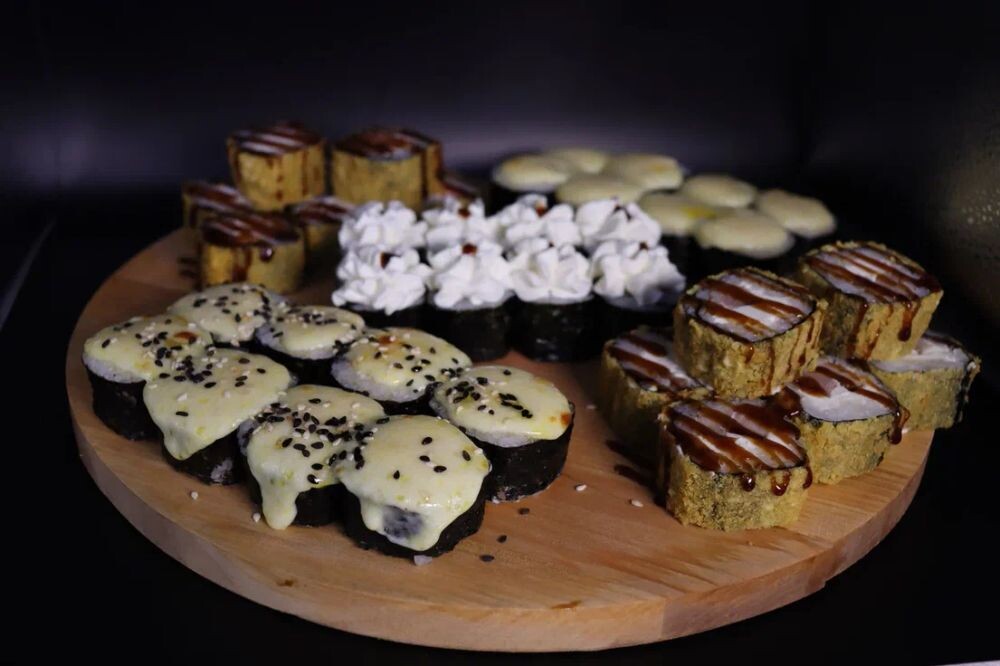 Холодный с лососем. горячий с угрем, горячий с крабом, запеченный с курицей, запеченный с ветчиной