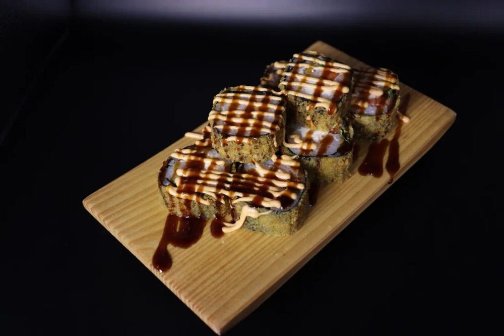 Креветка, лосось, лист салата, унаги, сливочный сыр, соус спайси