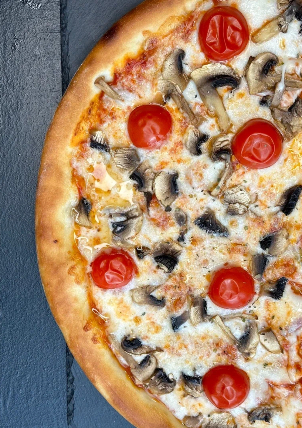Сыр моцарелла, грибы, помидоры черри, орегано, соус