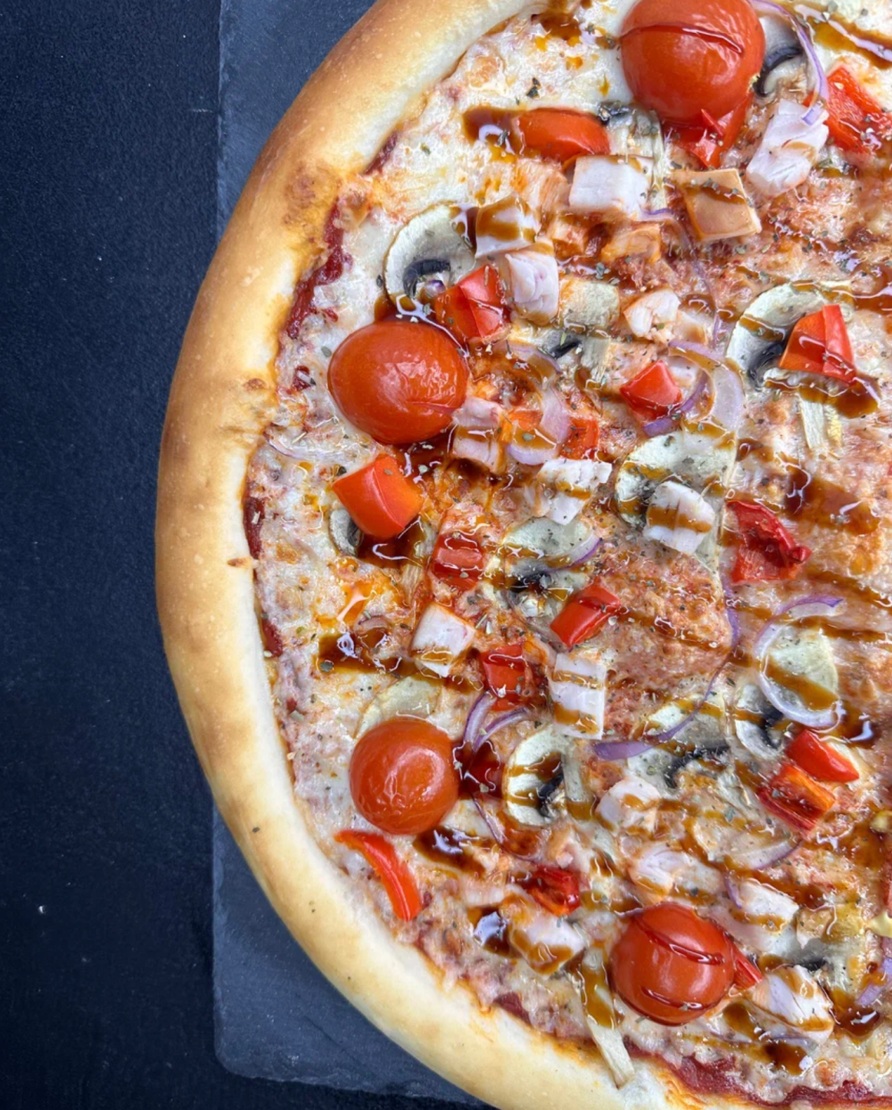Соус, сыр моцарелла, соус терияки, курица х/к, перец болгарский, грибы, орегано, черри, лук красный и зеленый