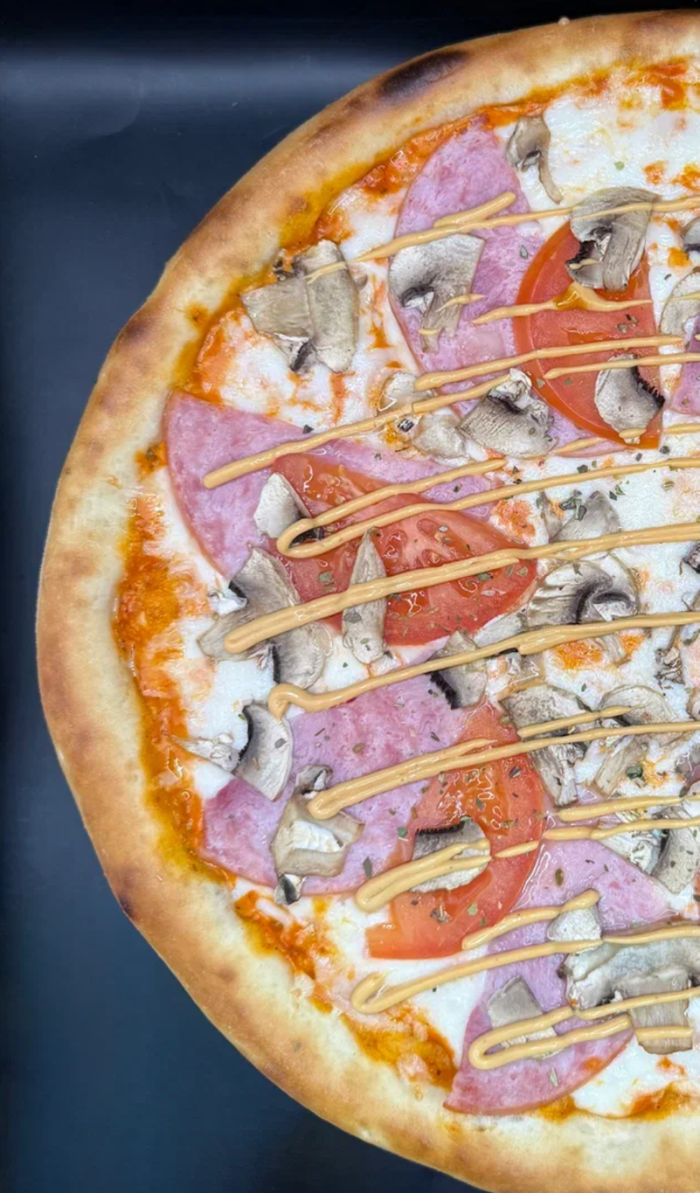 Моцарелла, ветчина, томаты, грибы, соус, гриль соус