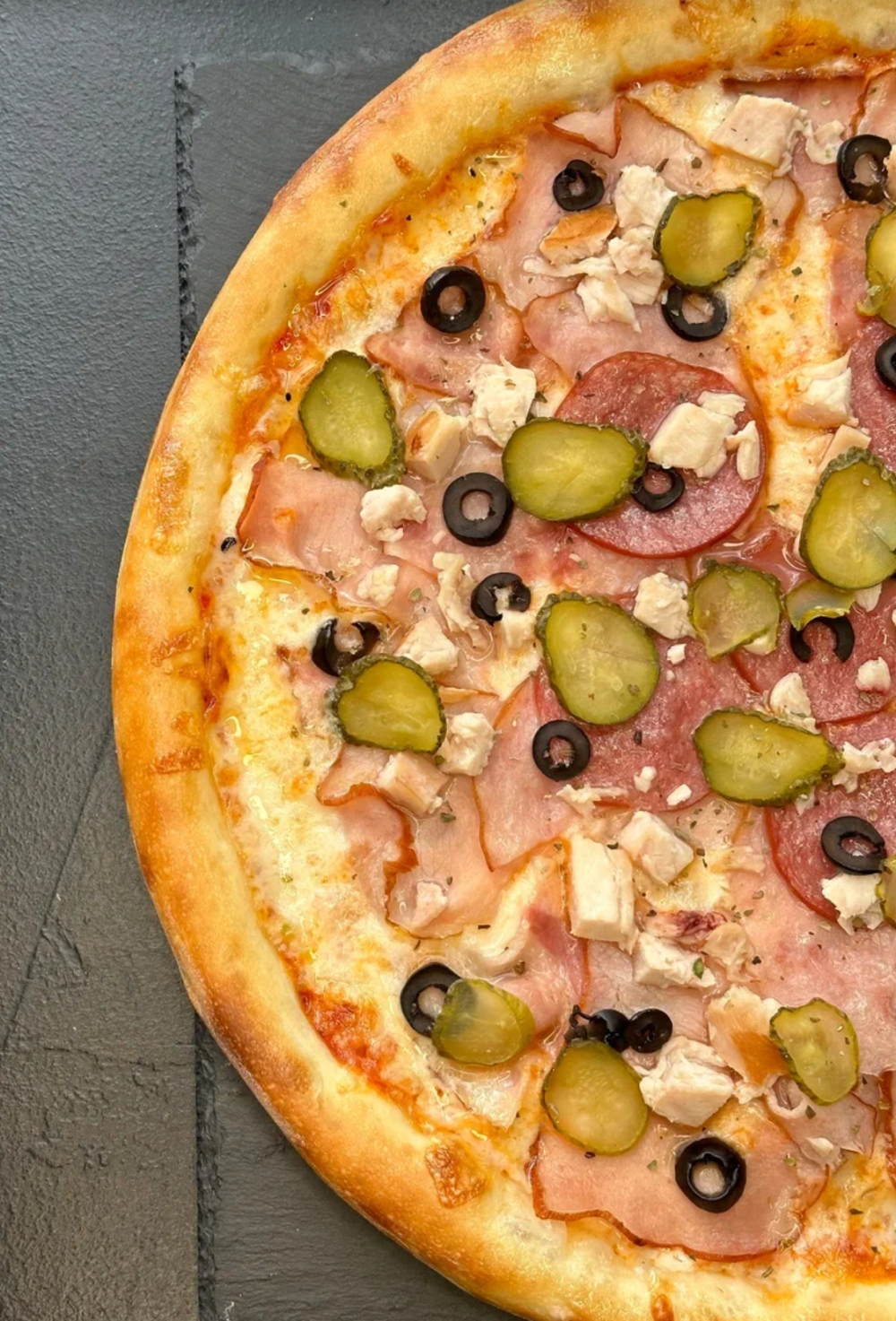 Курица х/к, ветчина, карбонад, бекон, салями, соус, маслины, орегано, огурчики маринованные, сыр моцарелла