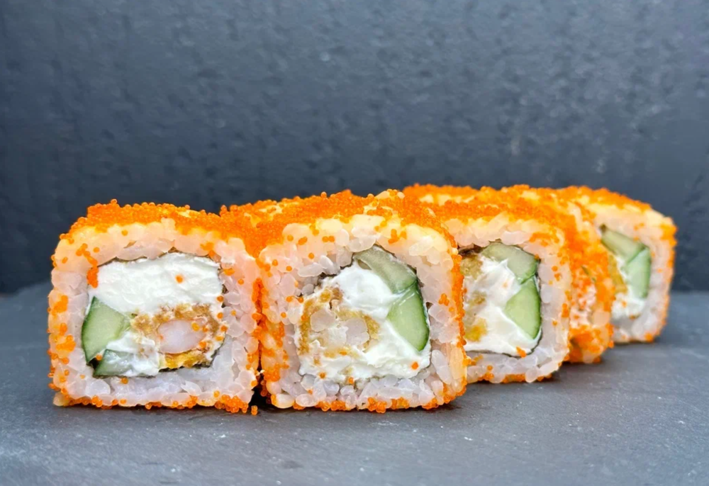Креветка в кляре, сливочный сыр, огурец, икра тобико