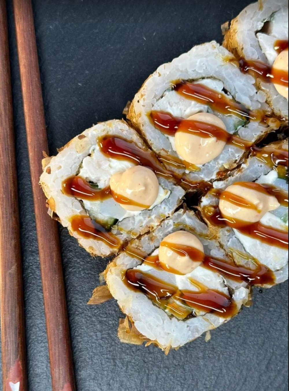 Кальмар, курица х/к, огурец, сливочный сыр, стружка тунца, спайси, унаги