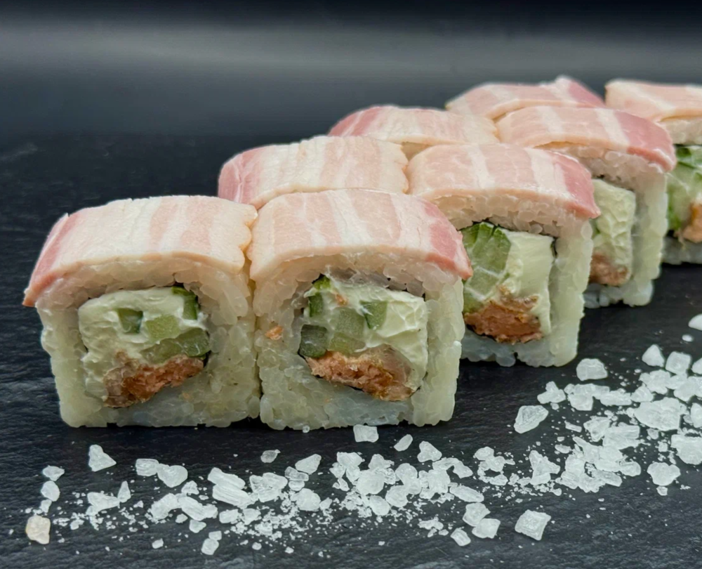 Сливочный сыр, жареный лосось, бекон, огурец