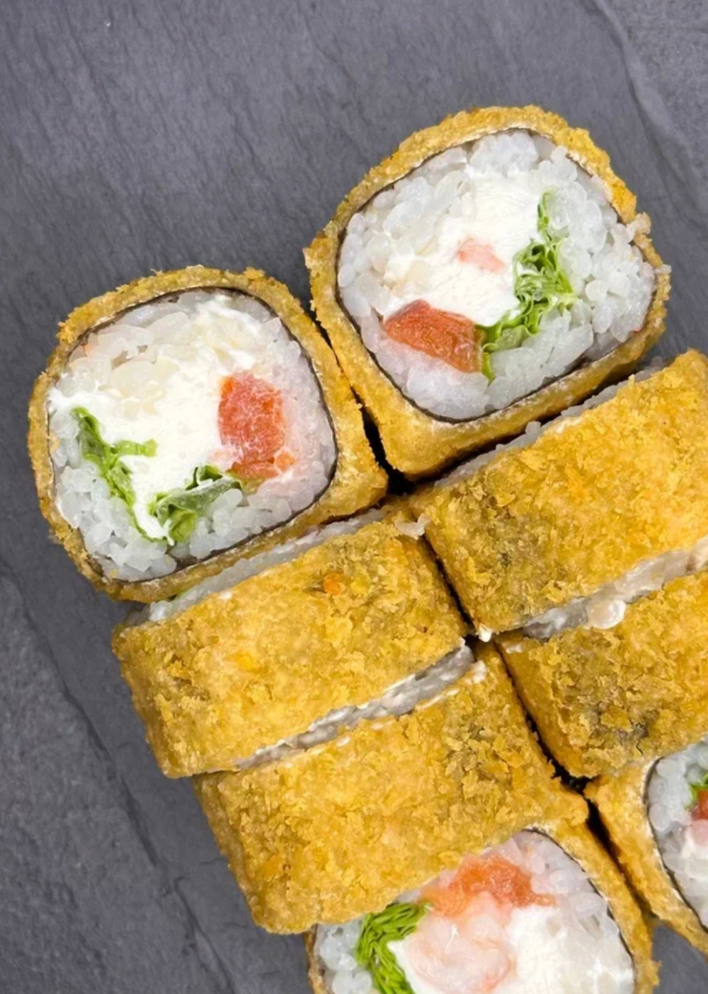 Креветка, лосось, лист салата, унаги, сливочный сыр, соус спайси, темпура