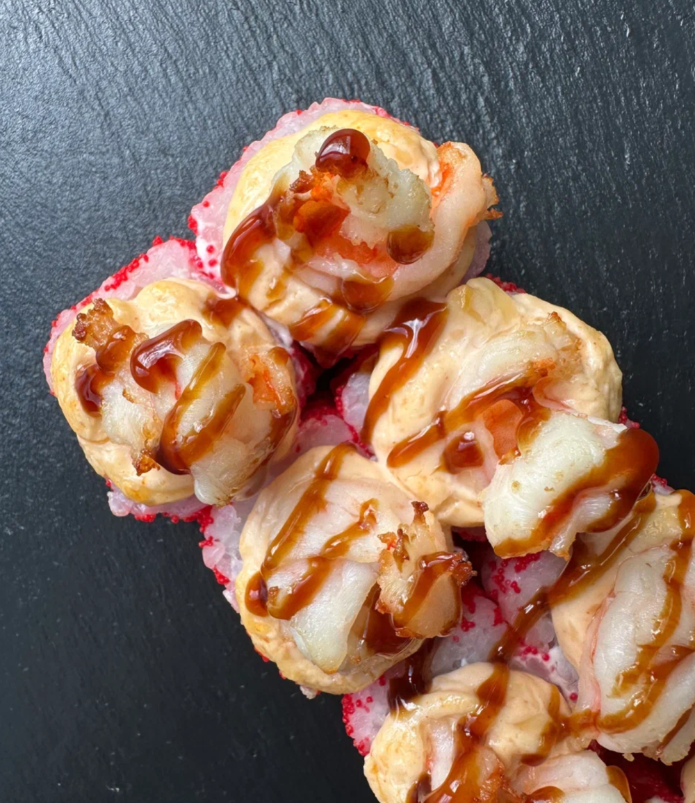 Лосось, сливочный сыр, огурец, жареная креветка, икра тобико, соус спайси, моцарелла