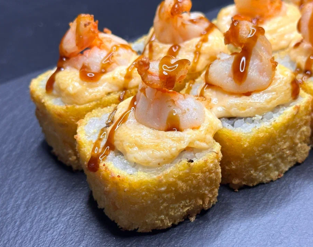 Креветка, лосось, огурец, темпура, соус спайси, моцарелла, унаги, авокадо