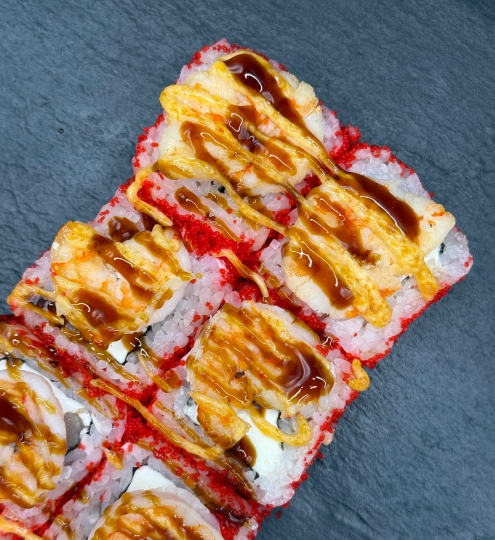 Угорь, креветка, сливочный сыр, тобико, унаги, спайси соус