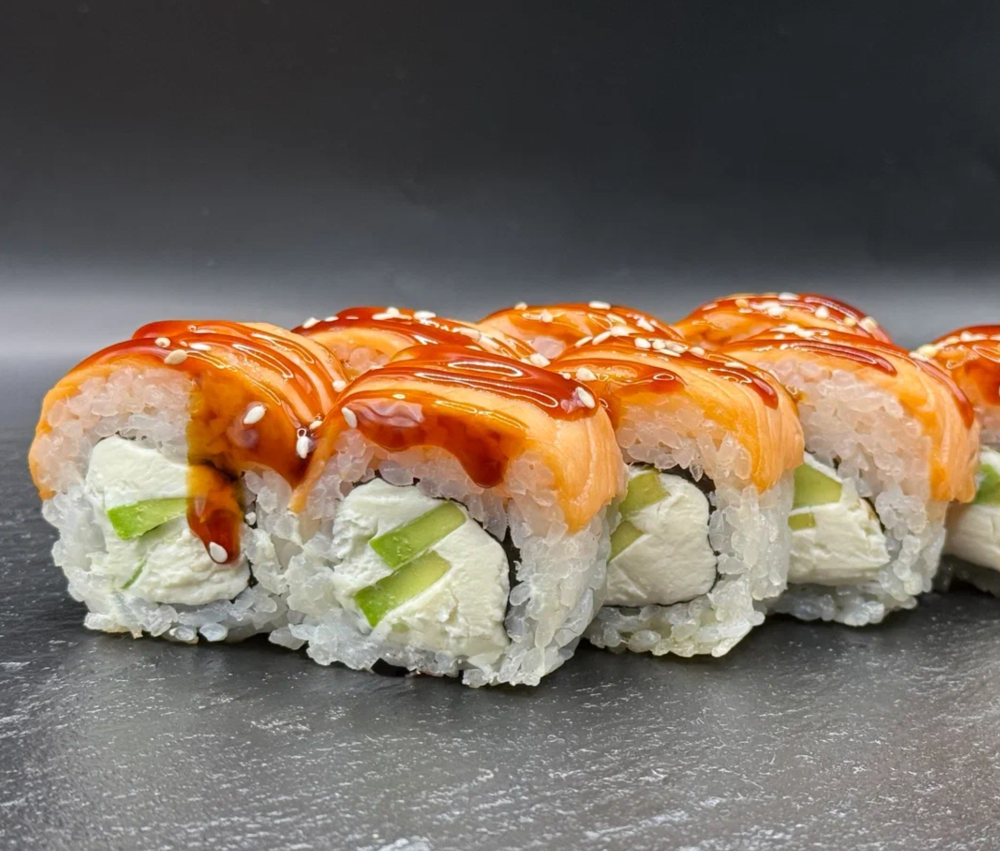 Лосось, сливочный сыр, авокадо, унаги, кунжут