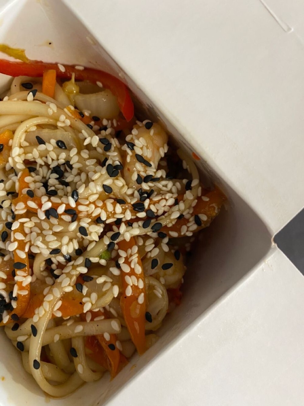 Лапша удон, болгарский перец, красный лук, стручковая фасоль, соевый соус, терияки, кунжут.